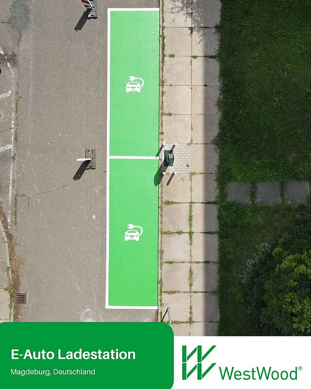 Das Baudezernat Magdeburg hat eine eigene Ladesäule für Dienstfahrzeuge mit Elektroantrieb errichten lassen. Um die zugehörigen Lade- und Parkflächen deutlich sichtbar zu gestalten, durften wir diese mit unserem WeTraffic 496 BX im Farbton 6037 beschichten.