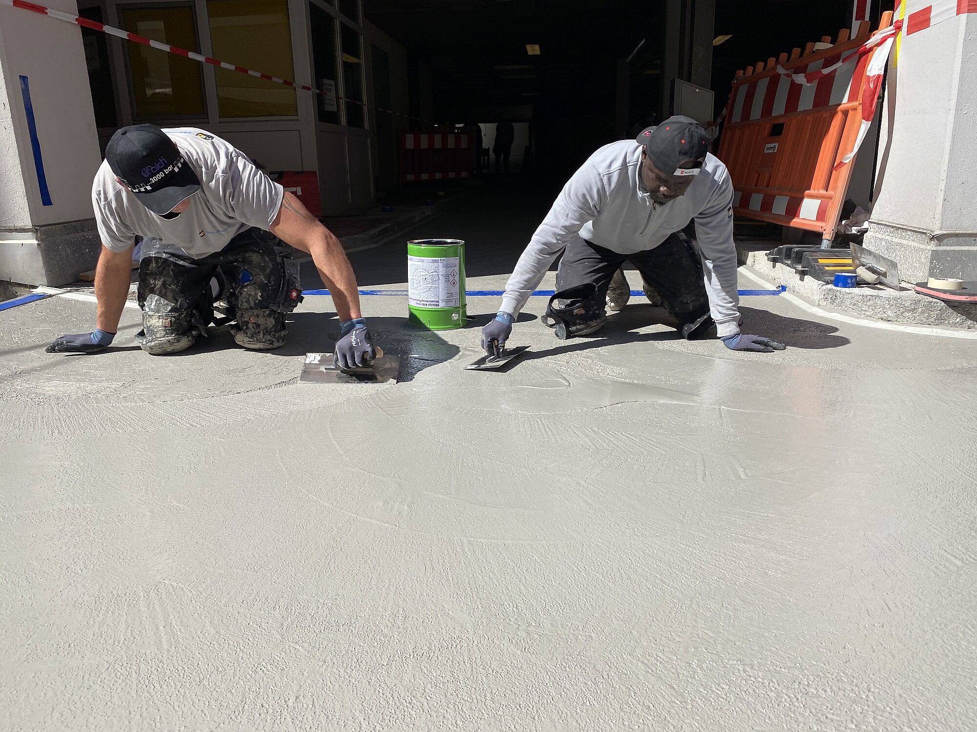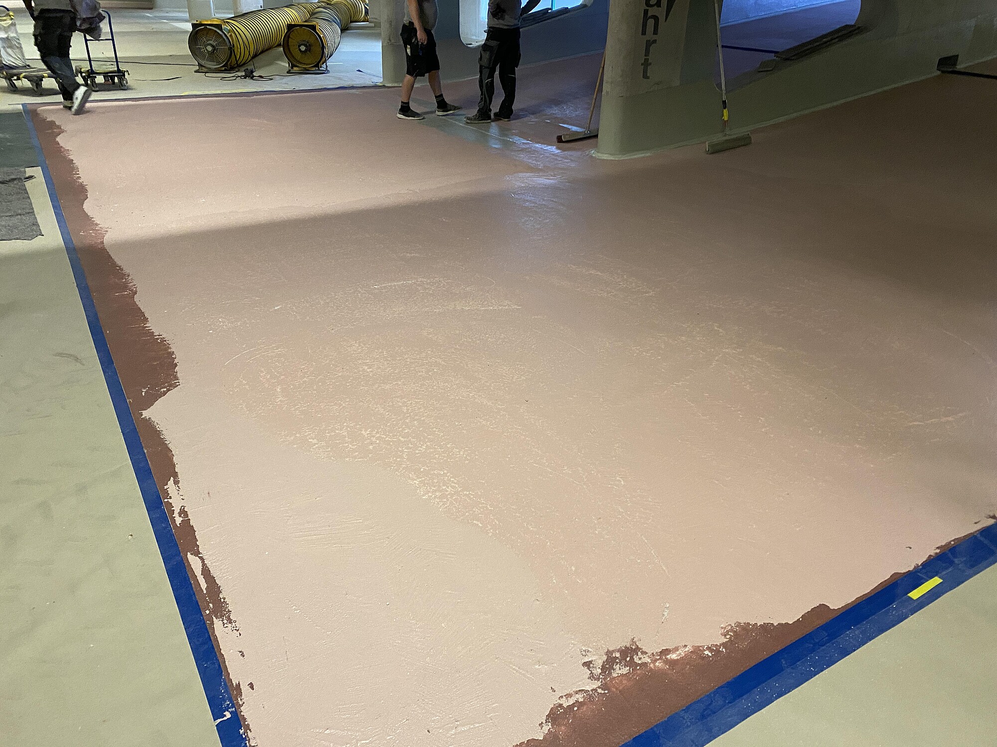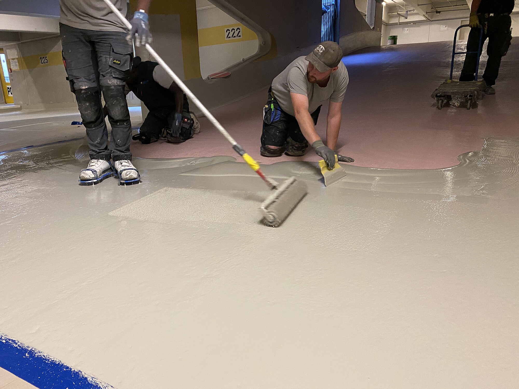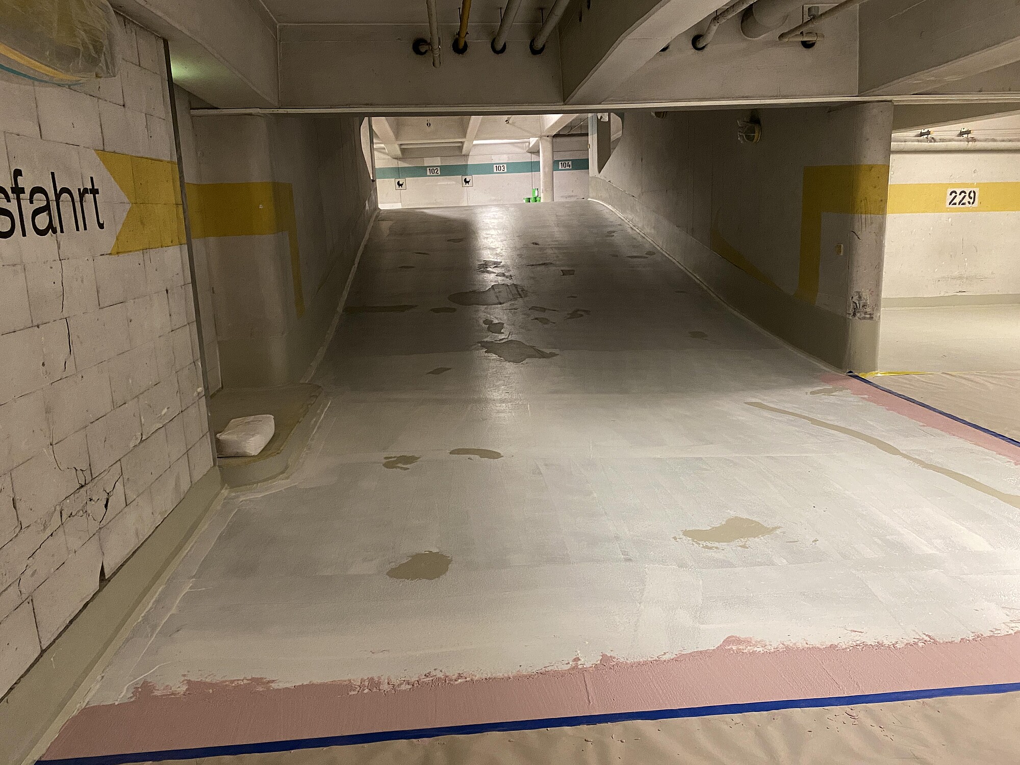 For the repair of this parking garage, two OS 11b systems were combined: a PU system for normally frequented areas and the WestWood Wecryl OS 11b for heavily frequented areas. Although an OS 11b is only recommended to a limited extent by the wider professional community for high-traffic surfaces, the use of the WestWood system is suitable precisely for these areas thanks to its excellent PMMA properties. The dynamic crack bridging properties, the high wear resistance as well as the cost effectiveness characterize this system. For maximum durability, an increased wear reserve of the wear layer was required. This was ensured by splitting the Wecryl 418 structural coating during application in two working steps. The result: a protection system perfectly matched to the requirements of the structure!