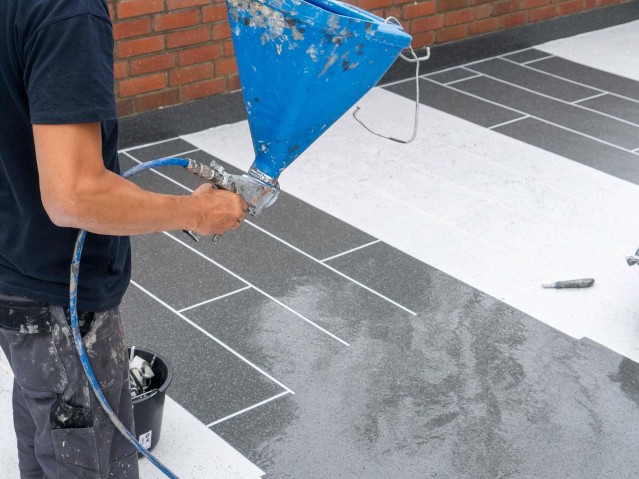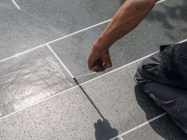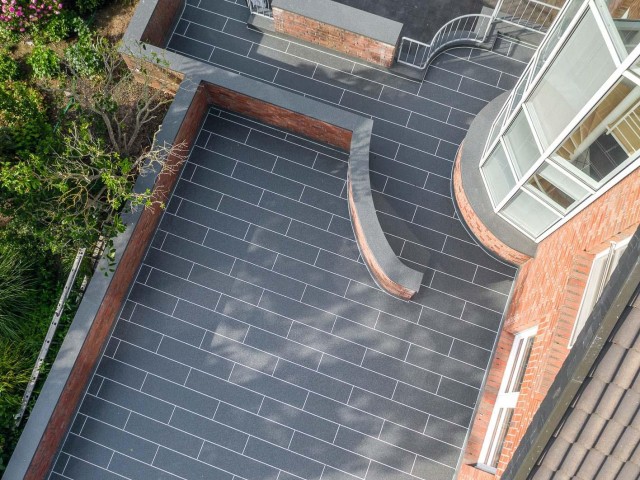 When a terrace runs around a rounded bay window and an equally rounded wall surround paves the way to the garden stairs, the use of a PMMA system makes the renovation of the outdoor area much easier: Cutting work is eliminated and the secure detailed sealing is provided with fleece reinforcement without seams or joints. Thus, for the renovation of the terrace and stairs, the client relied on the Wecryl waterproofing system in accordance with DIN 18531 from WestWood®, with which even the popular tile decor is possible. The specialist installers removed the previous covering and prepared the screed for the PMMA system. On top of the Wecryl 176 priming resin, they applied the surface waterproofing with a fleece reinforcement. For the detail joints, they used the waterproofing resin Wecryl R 230 thix, also with fleece, before two finish coats in different colors were applied to the protective layer of flow mortar Wecryl 333 to create the tile look.
