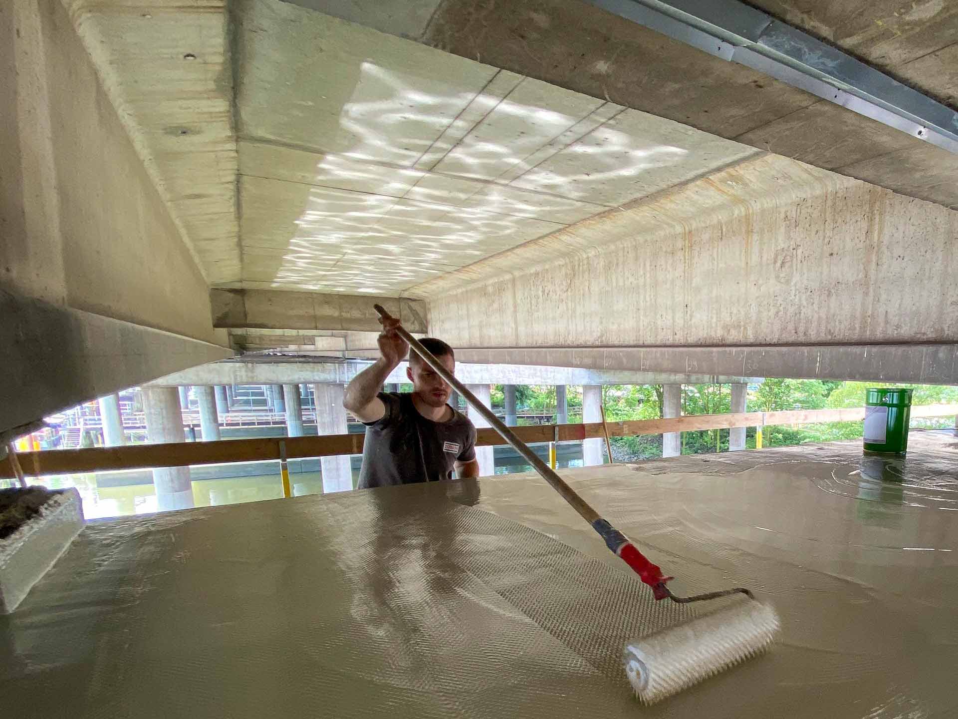 Between the Hamburg Elbe Tunnel and the A7 junction Hamburg-Hausbruch lies the Elbmarsch elevated highway, the longest highway bridge in Germany. As the elevated, 3.8 km long bridge structure is being extended, a comprehensive refurbishment was due. The transom tops in the bridge axes with transition structure were refurbished with PMMA products from WestWood: Nine axles and one abutment were fully coated. Among other things, Wecryl 418 was used - a new, highly chemical-resistant, slip-resistant wearing course. The client's representative decided in favor of PMMA due to the special material properties and the available testability certificate according to ZTV.-Ing. part 3, section 4, ANNEX F: WestWood is the only manufacturer of PMMA system solutions to have these usability certificates.